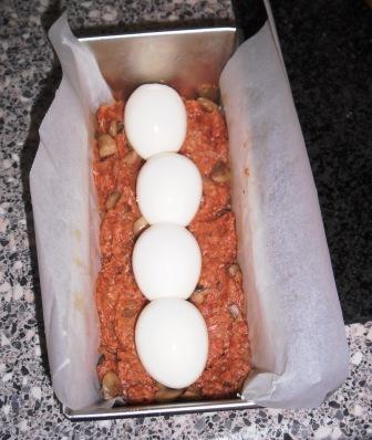 Verdeel een derde van het gehakt in de cakevorm, leg hier de gekookte eieren op en dek af met de rest van het gehakt. Schuif de cakevorm in de oven en bak het gehakt in de oven in circa 30 minuten gaar.